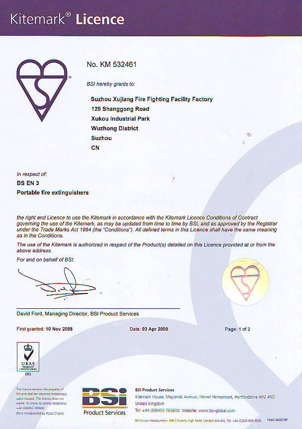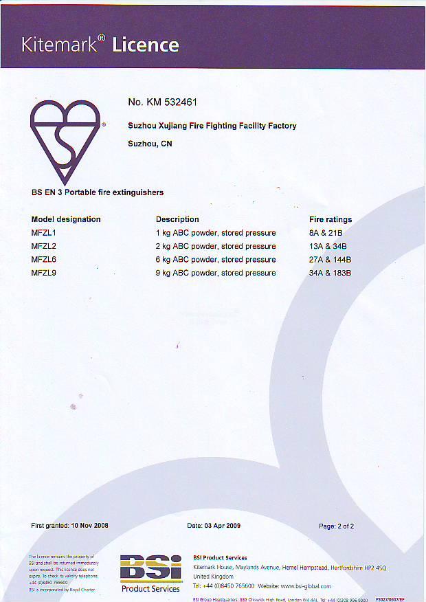 In Apr 3.2009 we got BSI kitemark Licence for portable extinguisher as